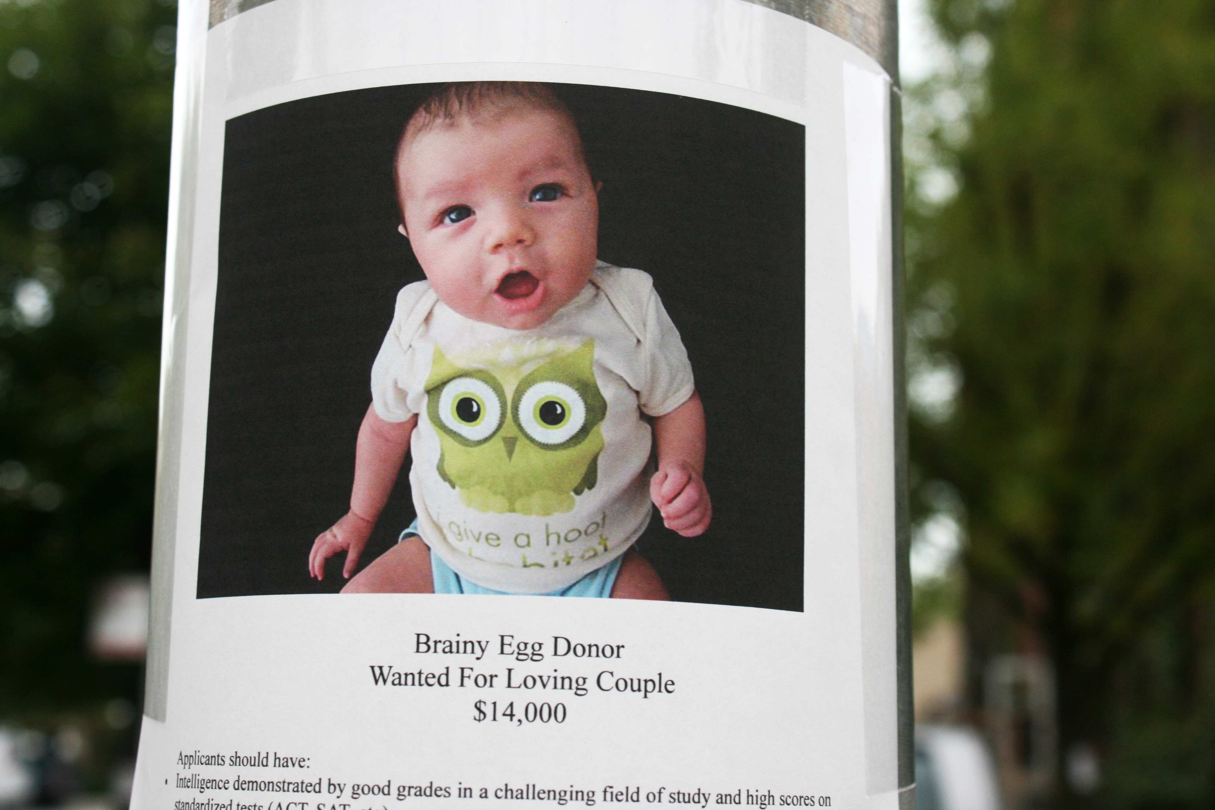 Egg donation—becoming a vehicle for assisted embryo transfer—was actually something I knew a bit about. As an undergrad, I’d spent twenty to thirty hours a week waitressing and much of the remaining time getting loaded with friends. But when I did venture to the wrought-iron-gated, suburban Chicago campus of Northwestern University, it wasn’t uncommon to see papered to the fat trunks of oak trees fliers that featured smiling, college-aged women surrounded by large-print dollar signs.