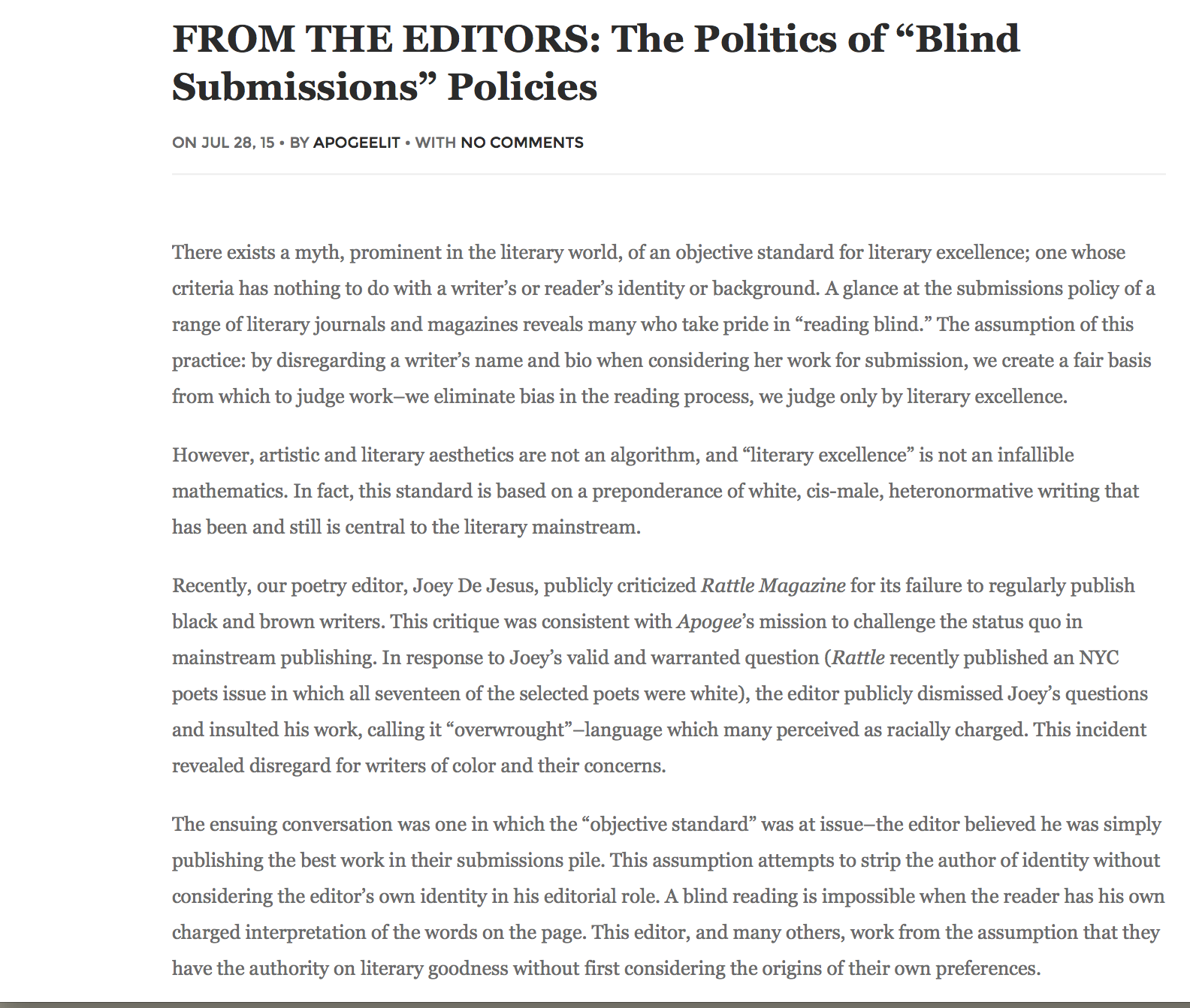 A few weeks ago poet and Apogee editor Joey de Jesus offered the journal Rattle an important criticism about the lack of poets of color in their journal, particularly a latest issue that featured NY poets. Rattle’s initial response was aggressive and racially charged and attempted to claim that blind submissions eliminated bias.